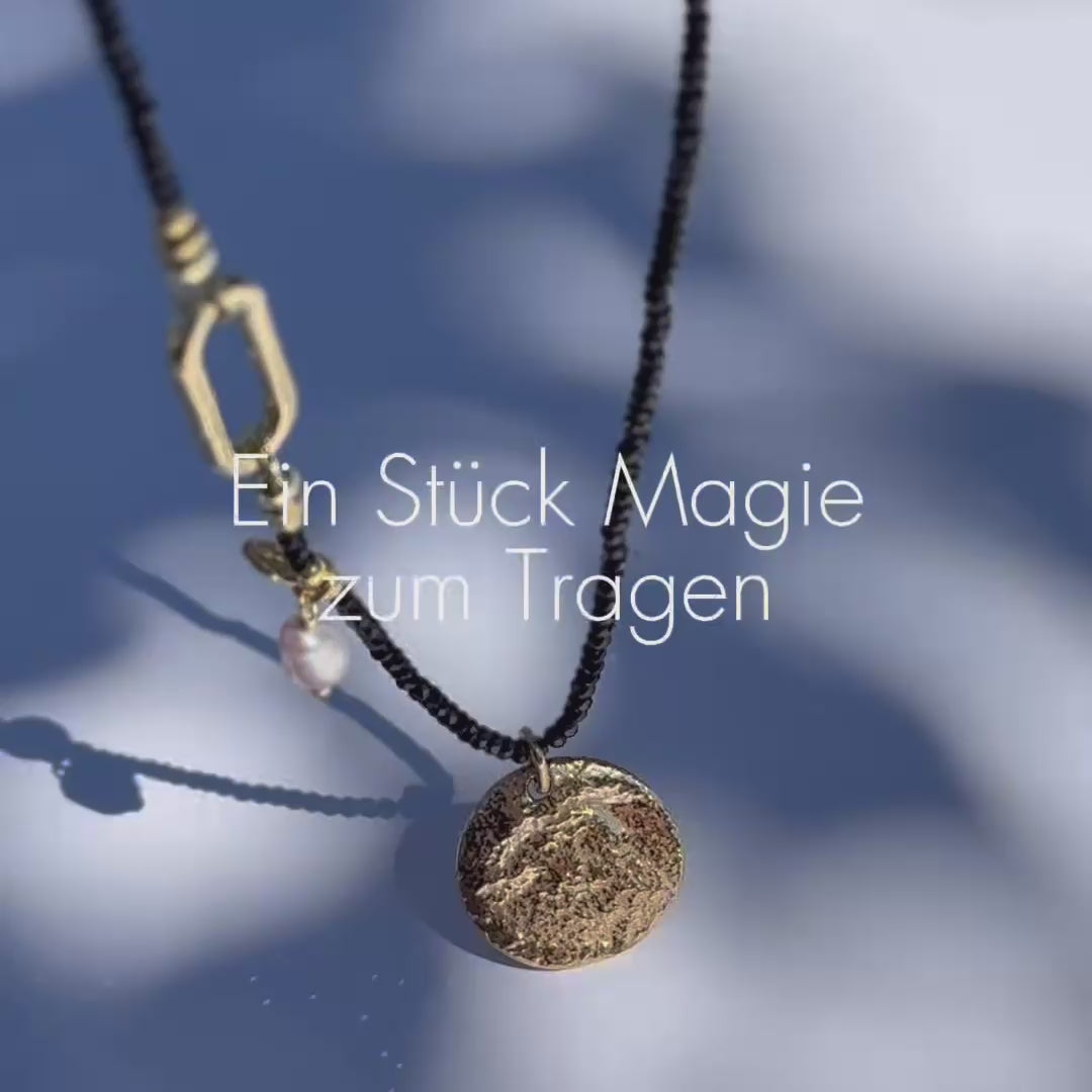 Diese Celestial Moon Kette vereint die mystische Kraft des Mondes mit der zeitlosen Eleganz des schwarzen Spinells. Der Coin-Anhänger erinnert an die geheimnisvolle Schönheit einer Mondlandschaft – so trägst du immer ein Stück vom Universum bei dir.